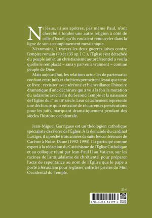 Mais aujourd’hui, les relations actuelles de partenariat confiant entre juifs et chrétiens permettent l’essai que tente ce livre : revisiter avec sérénité et bienveillance l’histoire dramatique d’une déchirure qui a vu à la fois la mutation du judaïsme avec la fin du Second Temple et la naissance de l’Eglise du Ier au IIIe siècle. Leur détachement représente une déchirure qui a entrainé de récurrentes persécutions pour les juifs, marquant dramatiquement pendant des siècles l’histoire occidentale.