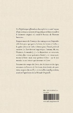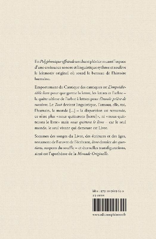 En Polyphonique offrande un chant plénier muant l’espace d’une croissance sonore et linguistique rythme et soulève le leitmotiv originel où sourd le berceau de l’histoire humaine. Emportement du Cantique des cantiques est L’imprédictible livre pour que germe la lettre, les lettres et l’arbre – la quête ultime de l’arbre à lettres pour l’inouïe prière de survivre. Le Tout devient linguistique, l’amour, elle, toi, l’humain, le monde [...] – la disparition est renversée, ce n’est plus « nous quitterons [terre] », ni « nous quitterons le livre » mais nous quittera le livre – car le seul monde, le seul vivant qui demeure est Livre. Sommes des songes du Livre, des écritures et des âges, testament de l’œuvre de l’écrivant, livre dernier des questions, suspens du souffle – et éternelles transfigurations, ainsi est l’apothéose de la Monade Originelle. Pierre Ech-Ardour réside à Sète. En son rapport intime aux lettres, sa poésie, « tours de mots » où interfèrent extrinsèques lumières et clartés profondes, incarne la parole d’une utopie propice à l’approche des sources du monde. Son mouvement poétique explore le croisement les langues et l'ambition du langage, comme retranchement de la mémoire, source de lumière et éclairement du monde et de ses mystères. Il reçoit le 6 octobre 2018 le Premier Prix de Poésie 2018 des Gourmets de Lettres sous l'égide de de l’Académie des Jeux Floraux de Toulouse pour le recueil Lagune - archipel de Thau