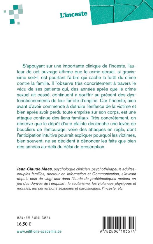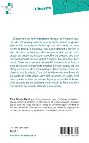 L'inceste est un double crime, crime sexuel contre l'enfance et crime affectif contre la famille. Jean-Claude Maes s'appuie sur un grand nombre de thérapies de personnes victimes d'inceste pour proposer de cette problématique une approche originale, qu'il développe en trois grandes parties : la victime, les motivations du coupable et la question de la réparation.