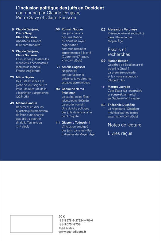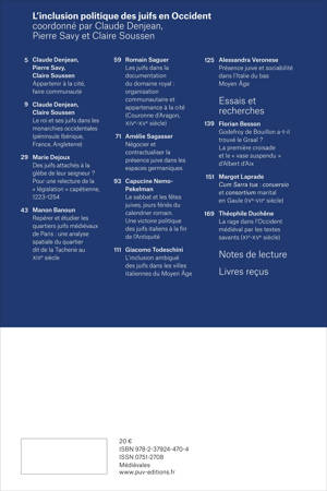Numéro consacré au renouvellement de l'historiographie des Juifs médiévaux. Les contributeurs examinent diverses modalités de leur inclusion politique dans plusieurs Etats occidentaux, entre la fin de l'Antiquité et le Moyen Age tardif.