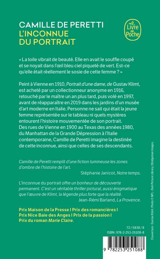 « La toile vibrait de beauté. Elle en avait le souffle coupé et se noyait dans l’œil bleu ciel piqueté de vert. Est-ce qu’elle était réellement le sosie de cette inconnue ? » Peint à Vienne en 1910, le tableau de Gustav Klimt, Portrait d’une dame, est acheté par un collectionneur anonyme en 1916, retouché par le maître un an plus tard, volé en 1997 avant de réapparaître en 2019 dans les jardins d’un musée d’art moderne en Italie. Personne ne sait qui était la jeune femme représentée dans le tableau ni quels mystères entourent l’histoire mouvementée de son portrait. Des rues de Vienne en 1900 au Texas des années 1980, du Manhattan de la Grande Dépression à l’Italie contemporaine, Camille de Peretti imagine la destinée de cette jeune femme, ainsi que celles de ses descendants.