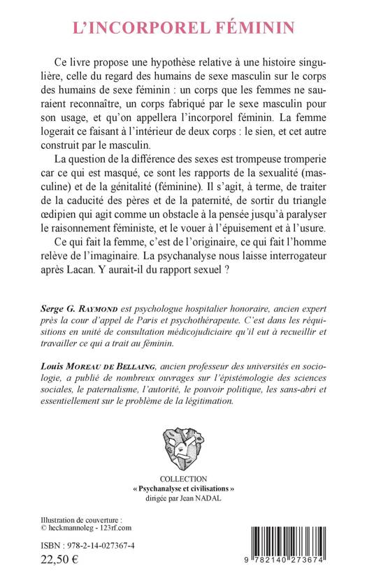 Ce livre propose une hypothèse relative à une histoire singulière, celle du regard des humains de sexe masculin sur le corps des humains de sexe féminin : un corps que les femmes ne sauraient reconnaître, un corps fabriqué par le sexe masculin pour son usage, et qu'on appellera l'incorporel féminin. La femme logerait ce faisant à l'intérieur de deux corps : le sien, et cet autre construit par le masculin. La question de la différence des sexes est trompeuse tromperie car ce qui est masqué, ce sont les rapports de la sexualité (masculine) et de la génitalité (féminine). Il s'agit, à terme, de traiter de la caducité des pères et de la paternité, de sortir du triangle dipien qui agit comme un obstacle à la pensée jusqu'à paralyser le raisonnement féministe, et le vouer à l'épuisement et à l'usure. Ce qui fait la femme, c'est de l'originaire, ce qui fait l'homme relève de l'imaginaire. La psychanalyse nous laisse interrogateur après Lacan. Y aurait-il du rapport sexuel ?