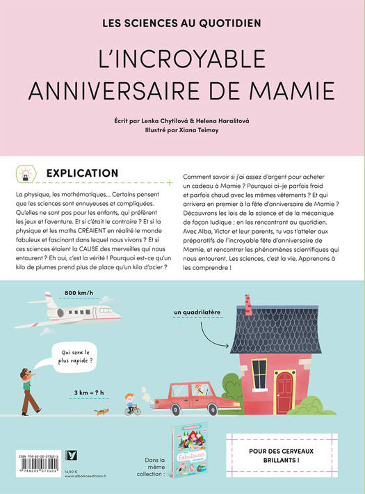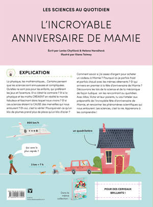 Donner les clés aux enfants pour leur faire aimer les sciences ! Chimie, physique... Certains pensent que les sciences sont ennuyeuses et compliquées. Qu’elles ne sont pas pour les enfants, qui préfèrent les jeux et l’aventure. Et si c‘était tout le contraire ? Et si la chimie et la physique créaient le monde merveilleux et fascinant dans lequel nous vivons ? Et si ces sciences étaient la cause des merveilles qui nous entourent ? C’est la vérité ! Pourquoi un kilo de plumes prend plus de place qu’un kilo d’acier ? Comment savoir si on a assez d’argent pour acheter un cadeau ? Pourquoi la pâte gonfle dans le four ? Découvrons les lois de la science de façon ludique : en les rencontrant au quotidien. Avec Alba, Victor et leurs parents, on va s’atteler aux préparatifs de la fête d’anniversaire de leur grand-mère et rencontrer les phénomènes scientifiques qui nous entourent. Les sciences, c’est la vie. Apprenons à les comprendre !