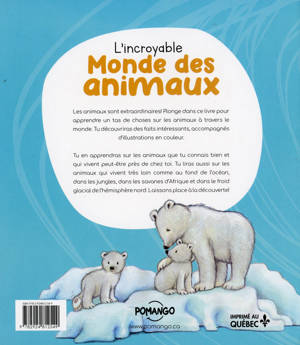 Les animaux sont extraordinaires ! Plonge dans ce livre pour apprendre un tas de choses sur les animaux à travers le monde. Tu découvriras des faits intéressants, accompagnés d’illustrations en couleur. Tu en apprendras sur les animaux que tu connais bien et qui vivent peut-être près de chez toi. Tu liras aussi sur les animaux qui vivent très loin comme au fond de l’océan, dans les jungles, dans les savanes d’Afrique et dans le froid glacial de l’hémisphère nord.Laissons place à la découverte !