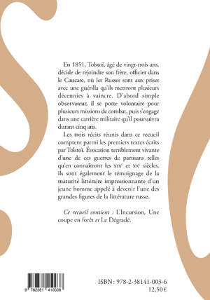 Les trois récits réunis dans ce recueil comptent parmi les premiers textes écrits par Tolstoï. Évocation terriblement vivante d’une de ces guerres de partisans telles qu’en connaîtront les XIXe et XXe siècles, ils sont également le témoignage de la maturité littéraire impressionnante d’un jeune homme appelé à devenir l’une des grandes figures de la littérature russe.