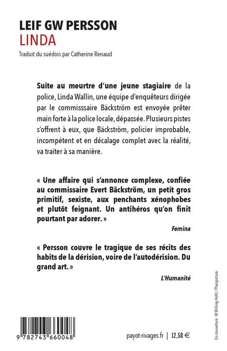 Premier tome de la célèbre trilogie mettant en scène Bäckström, enquêteur improbable et incompétent, envoyée prêter main forte pour résoudre le meurtre d'une jeune stagiaire de la police de Växjö. Leif GW Persson est un romancier et criminologue suédois, trois fois lauréat du prestigieux Grand Prix de littérature policière de l'Académie suédoise. Héritier de Sjöwall et Wahlöö, Persson se distingue par un propos politique et un humour dévastateur.
