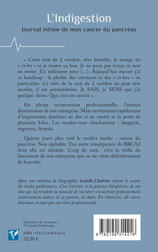 L'Indigestion Journal intime de mon cancer du pancréas Cette nuit du 2 octobre, rêve horrible, je mange du cr-be et je trouve ça bon. Je ne peux pas écrire ce mot en entier. J'ai tellement peur (...). Aujourd'hui encore j'ai ce handicap: la phobie des crustacés et des cr-bes en particulier. Ce rêve de la nuit du 2 octobre ne peut être anodin, il est prémonitoire. Je SAIS, je SENS que j'ai quelque chose. Que c'est un cancer . En pleine reconversion professionnelle, l'autrice démissionne de son entreprise. Mais surviennent rapidement d'importantes douleurs au dos et au ventre et la perte de plusieurs kilos. Les rendez-vous s'enchaînent: imagerie, urgences, biopsie. Quinze jours plus tard le verdict tombe: cancer du pancréas. Non opérable. Une autre conséquence du BRCA2 dont elle est atteinte. Coup du sort, c'est la veille du lancement de son entreprise que sa vie vient définitivement de basculer