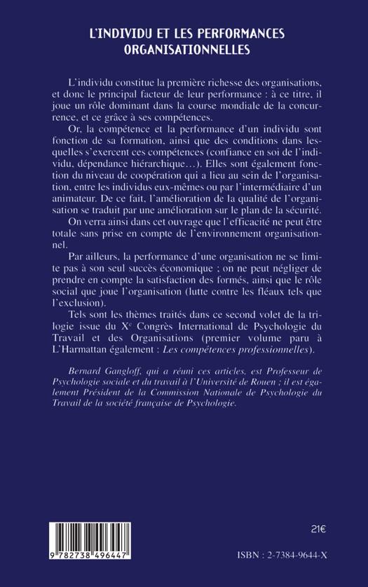 L'individu constitue la première richesse des organisations, et donc le principal facteur de leur performance. La compétence et la performance d'un individu sont fonction de sa formation, ainsi que des conditions dans lesquelles s'exercent ces compétences. La performance d'une organisation ne se limite pas à son seul succès économique ; on ne peut négliger de prendre en compte la satisfaction des formés, ainsi que le rôle social que joue l'organisation. Tels sont les thèmes traités dans cet ouvrage.