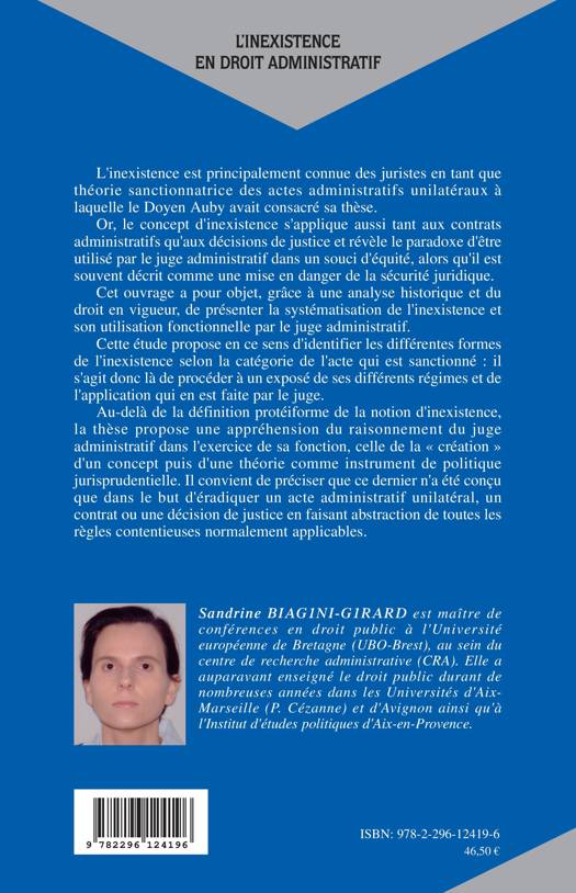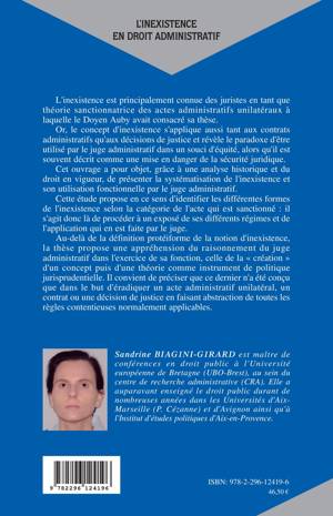 L'inexistence est principalement connue des juriste en tant que théorie sanctionnatrice des actes administratifs unilatéraux. Or le concept d'inexistence s'applique tant aux contrats administratifs qu'aux décisions de justice et révèle le paradoxe d'être utilisé par le juge administratif dans un souci d'équité, alors qu'il est souvent décrit comme une mise en danger de la sécurité juridique. Cet ouvrage présente la systématisation de l'inexistence et son utilisation fonctionnelle par le juge administratif.