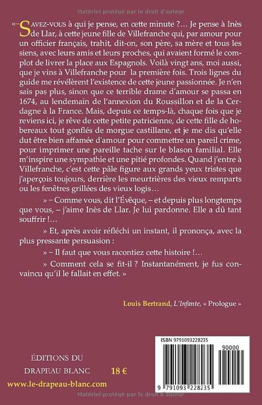 - Savez-vous à qui je pense, en cette minute ?... Je pense à Inès de Llar, à cette jeune fille de Villefranche qui, par amour pour un officier français, trahit, dit-on, son père, sa mère et tous les siens, avec leurs amis et leurs proches, qui avaient formé le complot de livrer la place aux Espagnols. Voilà vingt ans, moi aussi, que je vins à Villefranche pour la première fois. Trois lignes du guide me révélèrent l'existence de cette jeune passionnée. Je n'en sais pas plus, sinon que ce terrible drame d'amour se passa en 1674, au lendemain de l'annexion du Roussillon et de la Cerdagne à la France. Mais, depuis ce temps-là, chaque fois que je reviens ici, je rêve de cette petite patricienne, de cette fille de hobereaux tout gonflés de morgue castillane, et je me dis qu'elle dut être bien affamée d'amour pour commettre un pareil crime, pour imprimer une pareille tache sur le blason familial. Elle m'inspire une sympathie et une pitié profondes.