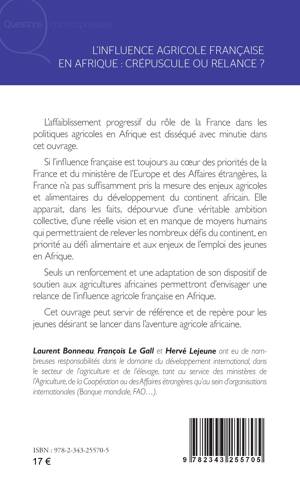 L’affaiblissement progressif du rôle de la France dans les politiques agricoles en Afrique est disséqué avec minutie dans cet ouvrage. Si l’influence française est toujours au coeur des priorités de la France et du ministère de l’Europe et des Affaires étrangères, la France n’a pas suffisamment pris la mesure des enjeux agricoles et alimentaires du développement du continent africain. Elle apparait, dans les faits, dépourvue d’une véritable ambition collective, d’une réelle vision et en manque de moyens humains qui permettraient de relever les nombreux défis du continent, en priorité au défi alimentaire et aux enjeux de l’emploi des jeunes en Afrique. Seuls un renforcement et une adaptation de son dispositif de soutien aux agricultures africaines permettront d’envisager une relance de l’influence agricole française en Afrique. Cet ouvrage peut servir de référence et de repère pour les jeunes désirant se lancer dans l’aventure agricole africaine.