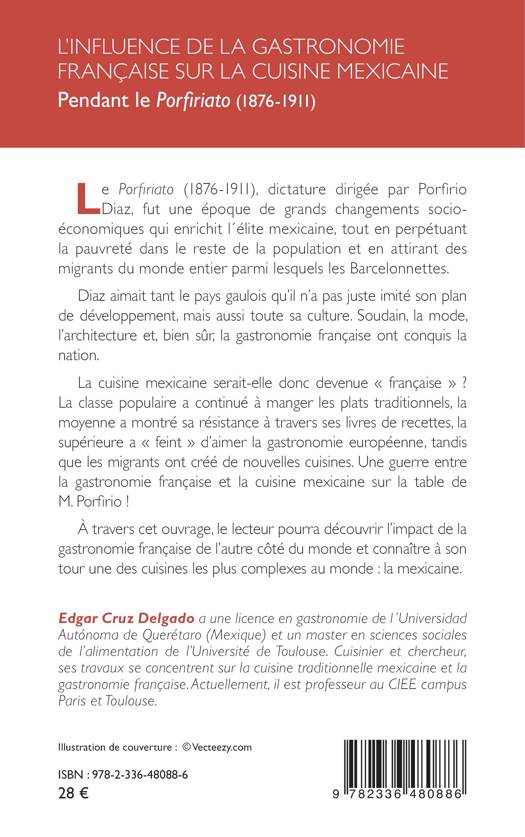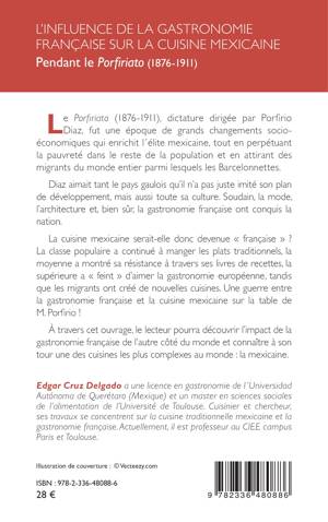 Le Porfiriato (1876-1911), dictature dirigée par Porfirio Diaz, fut une époque de grands changements socio-économiques qui enrichit l´élite mexicaine, tout en perpétuant la pauvreté dans le reste de la population et en attirant des migrants du monde entier parmi lesquels les Barcelonnettes. Diaz aimait tant le pays gaulois qu'il n'a pas juste imité son plan de développement, mais aussi toute sa culture. Soudain, la mode, l'architecture et, bien sûr, la gastronomie française ont conquis la nation. La cuisine mexicaine serait-elle donc devenue française La classe populaire a continué à manger les plats traditionnels, la moyenne a montré sa résistance à travers ses livres de recettes, la supérieure a feint d'aimer la gastronomie européenne, tandis que les migrants ont créé de nouvelles cuisines. Une guerre entre la gastronomie française et la cuisine mexicaine sur la table de M. Porfirio ! À travers cet ouvrage, le lecteur pourra découvrir l'impact de la gastronomie française de l'autre côté du monde et connaître à son tour une des cuisines les plus complexes au monde: la mexicaine.