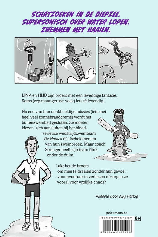 Link en Hud zijn broers met een levendige fantasie. Soms (zeg maar gerust: vaak) iets té levendig. Na een van hun denkbeeldige missies (iets met heel veel zonnebrandcrème) wordt het buitenzwembad gesloten. Ze moeten kiezen: zich aansluiten bij het bloedserieuze wedstrijdzwemteam De Haaien óf afscheid nemen van hun zwembroek. Maar coach Strenger heeft zijn team flink onder de duim.