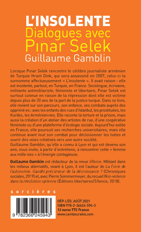 Lorsque Pınar Selek rencontre le célèbre journaliste arménien de Turquie Hrant Dink, qui sera assassiné en 2007, celui-ci la surnomme affectueusement « L'insolente ». Il avait raison : elle est insolente, partout, en Turquie, en France. Sociologue, écrivaine, militante antimilitariste, féministe et libertaire, Pınar Selek est surtout connue en raison de la répression dont elle est victime depuis plus de 20 ans de la part de la justice turque. Dans ce livre, elle revient sur son parcours, son enfance, ses combats auprès des opprimé·es : avec les enfants des rues d'Istanbul, les prostituées, les Kurdes, les Arménien·nes. Elle raconte la torture et la prison, mais aussi la création d'un atelier des artistes de rue, d'une coopérative féministe ou d'une plateforme d'écologie sociale. Aujourd'hui exilée en France, elle poursuit ses recherches universitaires, mais elle continue avant tout son combat pour décloisonner les luttes et ouvrir des voies créatives vers une autre société. Guillaume Gamblin, qu'elle a connu à Lyon et qui est devenu son ami, nous invite, à partir d'entretiens, à rencontrer cette « femme aux mille vies » à l'énergie contagieuse.