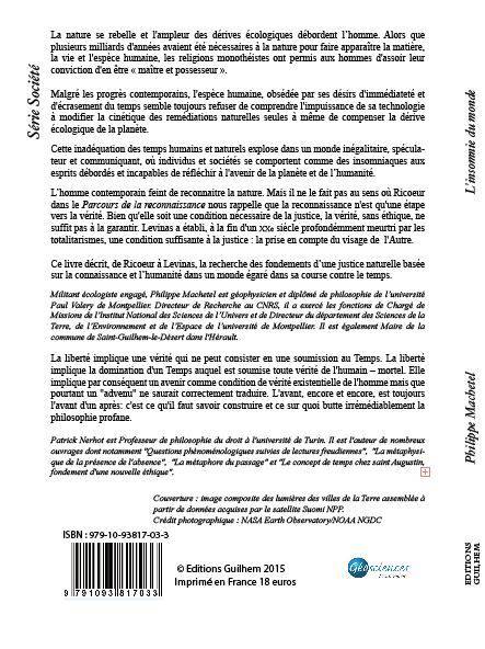 L’homme contemporain feint de reconnaitre la nature. Mais il ne le fait pas au sens où Ricoeur dans le Parcours de la reconnaissance nous rappelle que la reconnaissance n'est qu'une étape vers la vérité. Bien qu'elle soit une condition nécessaire de la justice, la vérité, sans éthique, ne suffit pas à la garantir. Levinas a établi, à la fin d'un XXe siècle profondémment meurtri par les totalitarismes, une condition suffisante à la justice : la prise en compte du visage de l'Autre.