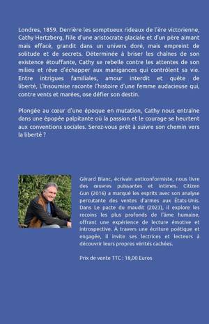 Londres, 1859. Derrière les somptueux rideaux de l'ère victorienne, Cathy Hertzberg, fille d’une aristocrate glaciale et d’un père aimant mais effacé, grandit dans un univers doré, mais empreint de solitude et de secrets. Déterminée à briser les chaînes de son existence étouffante, Cathy se rebelle contre les attentes de son milieu et rêve d'échapper aux manigances qui contrôlent sa vie. Entre intrigues familiales, amour interdit et quête de liberté, L'Insoumise raconte l’histoire d’une femme audacieuse qui, contre vents et marées, ose défier son destin. Plongée au cœur d'une époque en mutation, Cathy nous entraîne dans une épopée palpitante où la passion et le courage se heurtent aux conventions sociales. Serez-vous prêt à suivre son chemin vers la liberté ?