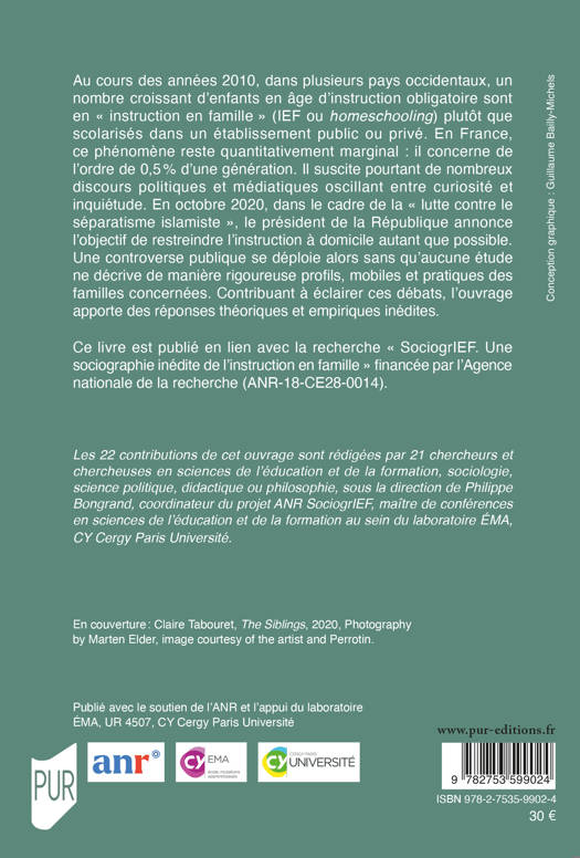 Ce livre est publié en lien avec la recherche « SociogrIEF. Une sociographie inédite de l’instruction en famille » financée par l’Agence nationale de la recherche (ANR-18-CE28-0014).