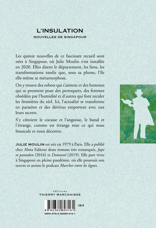 Les quinze nouvelles de ce fascinant recueil sont nées à Singapour, où Julie Moulin s’est installée en 2020. Elles disent le dépaysement, les liens, les transformations tandis que, sous sa plume, l’île elle-même se métamorphose. On y trouve des robots qui s’aiment et des hommes qui se prennent pour des perroquets, des femmes obsédées par l’humidité et d’autres qui font reculer les frontières du réel. Ici, l’actualité se transforme en parasites et des détritus emportent avec eux leurs secrets. S’y côtoient le cocasse et l’angoisse, le banal et l’étrange, comme est étrange tout ce qui nous bouscule et nous décentre. Julie Moulin est née en 1979 à Paris. Elle a publié chez Alma Editeur deux romans très remarqués, Jupe et pantalon (2016) et Domovoï (2019). Elle part vivre à Singapour en pleine pandémie, où elle poursuit son oeuvre et anime le podcast "Marcher entre les lignes".