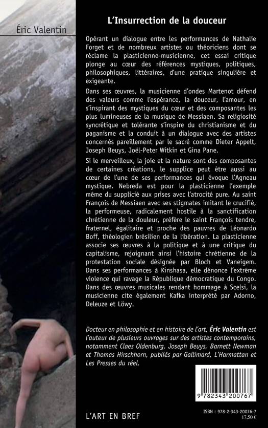 Opérant un dialogue entre les performances de Nathalie Forget et de nombreux artistes ou théoriciens dont se réclame la plasticienne-musicienne, cet essai critique plonge au coeur des références mystiques, politiques, philosophiques, littéraires, d'une pratique singulière et exigeante. Dans ses oeuvres, la musicienne d'ondes Martenot défend des valeurs comme l'espérance, la douceur, l'amour, en s'inspirant des mystiques du coeur et des composantes les plus lumineuses de la musique de Messian. Sa religiosité syncrétique et tolérante s'inspire du christianisme et du paganisme et la conduit à un dialogue avec des artistes concernés également par le sacré comme Dieter Appelt, Joseph Beuys, Joël-Peter Witkin et Gina Pane.