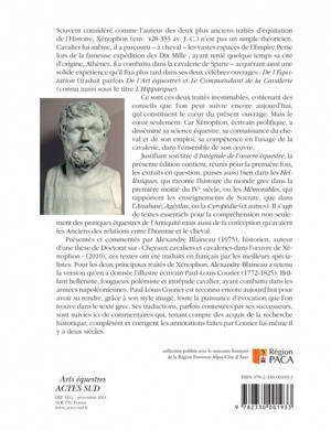 L'Athénien Xénophon (environ 428 - environ 355 avant Jésus-Christ) est l'auteur d'une oeuvre considérable. Outre les Helléniques, qui raconte l'histoire du monde grec dans la première moitié du IVe siècle, ou bien les Mémorables, qui rapportent les enseignements de Socrate, il est connu pour avoir écrit l'un des premiers traités équestres du monde occidental. Ce cavalier athénien, qui a parcouru les vastes espaces de l'Empire perse lors de l'expédition des Dix Mille, et qui a combattu auprès des Spartiates tout en ayant renié quelque temps sa cité d'origine, a acquis une solide expérience équestre qu'il a voulu, par souci didactique, fixer par écrit. Outre l'Art équestre, qui donne des conseils que l'on peut suivre encore aujourd'hui, il a rédigé un traité destiné à un commandant de la cava