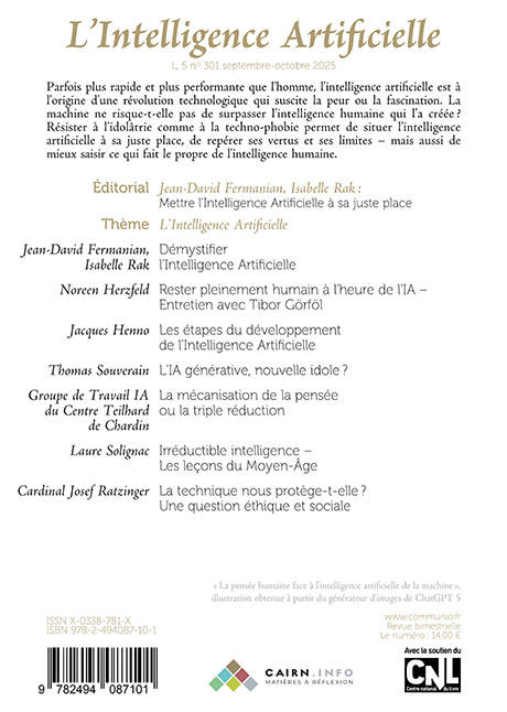 Parfois plus rapide et plus performante que l'homme, l'intelligence artificielle est à l'origine d'une révolution technologique qui suscite la peur ou la fascination. La machine ne risque-t-elle pas de surpasser l'intelligence humaine qui l'a créée ? Ce nouveau numéro ne se veut ni idolâtre ni technophobe : démystifier l'intelligence artificielle permet d'en comprendre les vertus et les limites. Identifier les mécanismes qu'elle reproduit offre aussi une occasion salutaire de mieux saisir ce qui fait le propre de l'intelligence humaine : l'étonnement, l'admiration, la créativité et la relation à autrui sont irréductibles aux fonctions qu'assure une machine. Avec notamment des contributions d'Isabelle Rak, Laure Solignac, Jean-David Fermanian, Jacques Henno et du groupe Teilhard de Chardin , et un texte inédit en français de Joseph Ratzinger sur les relations entre éthique et technique.