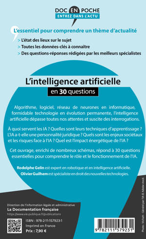 L'accélération du développement technologique de l'IA la met au premier plan de nombreuses préoccupations. Sujet ambivalent, elle est pour certains considérée comme nécessaire à l’humanité, pour d’autres comme une technologie qui lui serait néfaste. Cet ouvrage donne toutes les clés d’analyse pour comprendre ce qu’est l’intelligence artificielle, son fonctionnement et ses applications dans la vie quotidienne, ainsi que les limites ou les enrichissements qui doivent lui être apportés. L’objectif du livre est de permettre à un public non spécialiste de comprendre les enjeux entourant l’intelligence artificielle en fournissant des outils pédagogiques de compréhension.