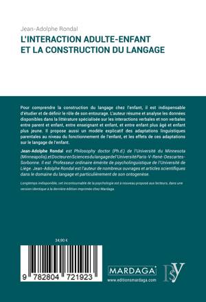Pour comprendre la construction du langage chez l'enfant, il est indispensable d'étudier et de définir le rôle de son entourage. L'auteur résume et analyse les données disponibles dans la littérature spécialisée sur les interactions verbales et non verbales entre parent et enfant, entre enseignant et enfant, et entre enfant plus âgé et enfant plus jeune. Il propose aussi un modèle explicatif des adaptations linguistiques parentales au niveau du fonctionnement de l'enfant, et les effets de ces adaptations sur le langage de l'enfant. Jean-Adolphe Rondal est Philosophy doctor (Ph.d.) de l'Université du Minnesota (Minneapolis), et Docteur en Sciences du langage de l'Université Paris-V-René-Descartes-Sorbonne. Il est Professeur ordinaire émérite de psycholinguistique de l'Université de Liège. Jean-Adolphe Rondal est l'auteur de nombreux ouvrages et articles scientifiques dans le domaine du langage et particulièrement de son ontogenèse.
