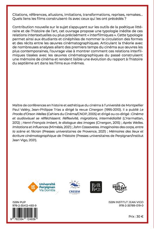 Cet ouvrage apporte une contribution inédite sur les relations intertextuelles que des films construisent avec des films antérieurs sous la forme de citations, références, allusions, imitations, transformations, reprises, remakes… Avec les outils de la poétique littéraire et de l’histoire de l’art, il propose une première typologie de ces relations « interfilmiques », utile aux étudiants et cinéphiles pour nommer la circulation des formes et des récits entre les œuvres cinématographiques. Articulant la théorie avec de nombreuses analyses de films de toutes époques, l’ouvrage vise à montrer comment ces relations interfilmiques tissées avec les œuvres cinématographiques du passé construisent une mémoire de cinéma et rendent lisible une évolution du rapport à l’histoire du 7e art dans les films eux-mêmes.
