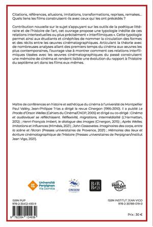 Cet ouvrage apporte une contribution inédite sur les relations intertextuelles en cinéma (citations, références, allusions, imitations, transformations…) et propose d’analyser à travers de nombreux exemples comment ces relations interfilmiques construisent une mémoire du cinéma véhiculée par les films eux-mêmes.