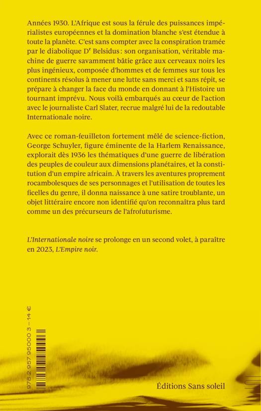 Premier volet paru sous forme de feuilleton de la saga de George Schuyler, L'Internationale noire est un véritable sommet de fiction spéculative, mêlant thématiques afrofuturistes et problématiques socio-politiques. Dans la plus pure tradition des littératures de genre de la première moitié du XXe siècle, ce roman d'aventures de science-fiction met en scène un groupe révolutionnaire radical noir, dirigé par le charismatique Dr Belsidus, qui se donne pour objectif de libérer l'Afrique des puissances impérialistes européennes. Un texte qui frappe par sa modernité esthétique et le caractère prophétique de certaines de ses intuitions - anti-racisme, panafricanisme, critique du colonialisme. Et qui pourra satisfaire les lecteurs de littérature de l'imaginaire tout autant que les amateurs de littérature nord-américaine contemporaine.