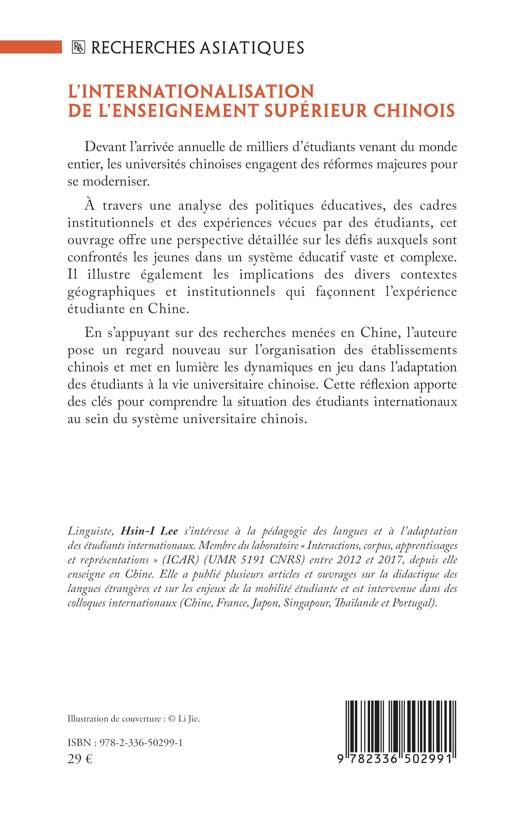 Devant l'arrivée annuelle de milliers d'étudiants venant du monde entier, les universités chinoises engagent des réformes majeures pour se moderniser. À travers une analyse des politiques éducatives, des cadres institutionnels et des expériences vécues par des étudiants, cet ouvrage offre une perspective détaillée sur les défis auxquels sont confrontés les jeunes dans un système éducatif vaste et complexe. Il illustre également les implications des divers contextes géographiques et institutionnels qui façonnent l'expérience étudiante en Chine. En s'appuyant sur des recherches menées en Chine, l'auteure pose un regard nouveau sur l'organisation des établissements chinois et met en lumière les dynamiques en jeu dans l'adaptation des étudiants à la vie universitaire chinoise. Cette réflexion apporte des clés pour comprendre la situation des étudiants internationaux au sein du système universitaire chinois.