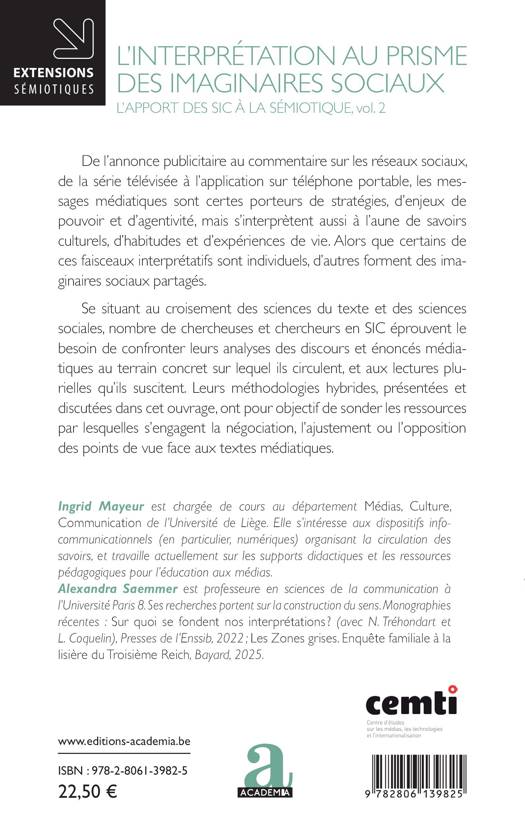 De l'annonce publicitaire au commentaire sur les réseaux sociaux, de la série télévisée à l'application sur téléphone portable, les messages médiatiques sont certes porteurs de stratégies, d'enjeux de pouvoir et d'agentivité, mais s'interprètent aussi à l'aune de savoirs culturels, d'habitudes et d'expériences de vie. Alors que certains de ces faisceaux interprétatifs sont individuels, d'autres forment des imaginaires sociaux partagés. Se situant au croisement des sciences du texte et des sciences sociales, nombre de chercheuses et chercheurs en SIC éprouvent le besoin de confronter leurs analyses des discours et énoncés médiatiques au terrain concret sur lequel ils circulent, et aux lectures plurielles qu'ils suscitent. Leurs méthodologies hybrides, présentées et discutées dans cet ouvrage, ont pour objectif de sonder les ressources par lesquelles s'engagent la négociation, l'ajustement ou l'opposition des points de vue face aux textes médiatiques.