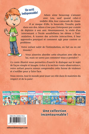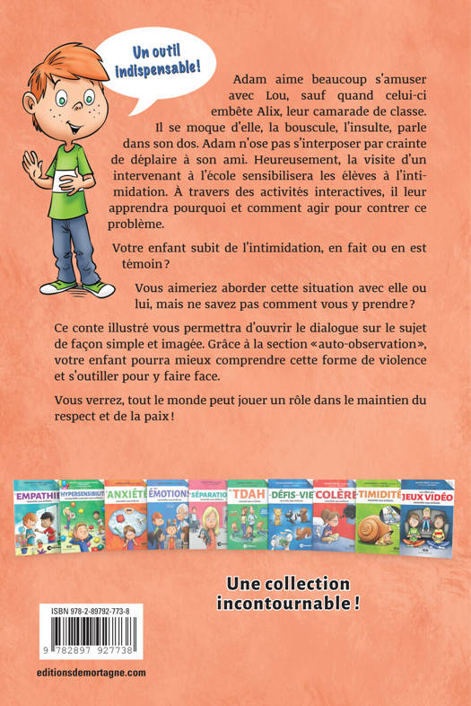 « Le sentiment d’appartenance est un besoin humain fondamental et vivre de l’exclusion provoque une souffrance comparable à une blessure physique, activant plusieurs des mêmes régions du cerveau. » Adam aime beaucoup s'amuser avec Lou, sauf quand celui-ci embête Alix, leur camarade de classe. Il se moque d'elle, la bouscule, l'insulte, parle dans son dos. Adam n'ose pas s'interposer par crainte de déplaire à son ami. Heureusement, la visite d'un intervenant à l'école sensibilisera les élèves à l'intimidation. À travers des activités interactives, il leur apprendra pourquoi et comment agir pour contrer ce problème. Votre enfant subit de l'intimidation, en fait ou en est témoin ? Vous aimeriez aborder cette situation avec elle ou lui, mais ne savez pas comment vous y prendre ? Ce conte illustré vous permettra d'ouvrir le dialogue sur le sujet de façon simple et imagée. Grâce à la section « auto-observation», votre enfant pourra mieux comprendre cette forme de violence et s'outiller pour y faire face.