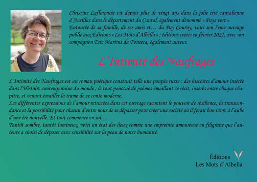 L'Intimité des Naufrages est un roman poétique construit comme une poupée russe. Des histoires d'amour dysfonctionnelles vécue par l'héroïne, au regard d'une réalité sombre. Elle tombera dans un burn-out, avant de pouvoir se retrouver, résilience par l'amour. Le texte se présente comme un assemblage de poésies.