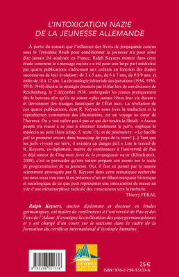 Cet ouvrage présente les 4 livres de propagande s'adressant chacun à une tranche d'âge précise conçus sous le Troisième Reich pour conditionner la jeunesse. Ralph Keysers nous en livre la traduction et la reproduction commentée des illustrations, témoignages de ce que peut représenter une intoxication de masse en vue d'une métamorphose radicale des consciences vers la barbarie.