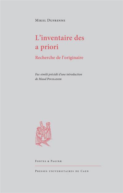 Dans L'inventaire des a priori, publié initialement en 1981 et aujourd'hui réédité par les Presses universitaires de Caen, Dufrenne expose sa conception bifide de l'a priori, à la fois subjectif et objectif, et l'ancre dans une philosophie de la Nature. L'enquête sur l'a priori devient ainsi une recherche de l'» originaire » antérieur à la distinction entre le sujet et l'objet. Dufrenne distingue les différentes régions du champ a priorique et se risque à proposer une liste des a priori. Le sentiment et l'expérience esthétique en sont les voies d'accès privilégiées. Ils permettent d'entrevoir un originaire brut, foyer de tous les possibles artistiques et politiques. L'introduction de Maud Pouradier à cette réédition resitue L'inventaire des a priori dans l'oeuvre de son auteur et souligne l'intérêt de relire Mikel Dufrenne dans le contexte d'une métaphysique contemporaine rejetant l'interrogation transcendantale et la philosophie du sujet au nom du réalisme.