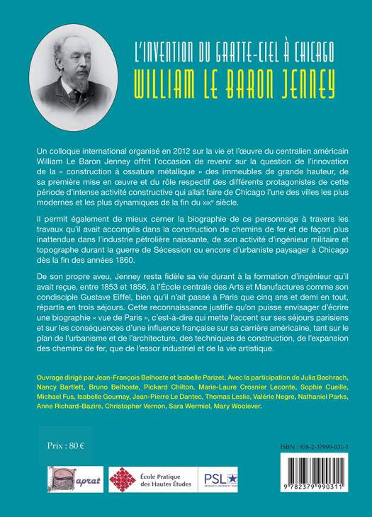 Un colloque international organisé en 2012 sur la vie et l'oeuvre du centralien américain William Le Baron Jenney offrit l'occasion de revenir sur la question de l'innovation de la construction à ossature métallique des immeubles de grande hauteur, de sa première mise en oeuvre et du rôle respectif des différents protagonistes de cette période d'intense activité constructive qui allait faire de Chicago l'une des villes les plus modernes et les plus dynamiques de la fin du xixe siècle. Il permit également de mieux cerner la biographie de ce personnage à travers les travaux qu'il avait accomplis dans la construction de chemins de fer et de façon plus inattendue dans l'industrie pétrolière naissante, de son activité d'ingénieur militaire et topographe durant la guerre de Sécession ou encore d'urbaniste paysager à Chicago dès la fin des années 1860. De son propre aveu, Jenney resta fidèle sa vie durant à la formation d'ingénieur qu'il avait reçue, entre 1853 et 1856, à l'École centrale des Arts et Manufactures comme son condisciple Gustave Eiffel, bien qu'il n'ait passé à Paris que cinq ans et demi en tout, répartis en trois séjours. Cette reconnaissance justifie qu'on puisse envisager d'écrire une biographie vue de Paris, c'est-à-dire qui mette l'accent sur ses séjours parisiens et sur les conséquences d'une influence française sur sa carrière américaine, tant sur le plan de l'urbanisme et de l'architecture, des techniques de construction, de l'expansion des chemins de fer, que de l'essor industriel et de la vie artistique.