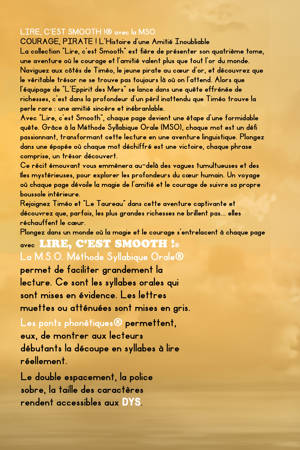 La Méthode Syllabique Orale (MSO) : Spécialement conçu pour non seulement apprendre à lire mais aussi pour apprendre à AIMER lire. La M.S.O. Méthode Syllabique Orale® permet de faciliter grandement la lecture. Ce sont les syllabes orales qui sont mises en évidence. Les lettres muettes ou atténuées sont mises en gris. Les ponts phonétiques® permettent, eux, de montrer aux lecteurs débutants la découpe en syllabes à lire réellement. Le double espacement, la police sobre, la taille des caractères rendent accessibles aux DYS. Partie de la Collection Appréciée : "Lire, c'est Smooth" est reconnue pour sa capacité à transformer la lecture en une aventure passionnante.