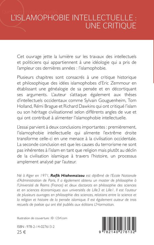 Cet ouvrage jette la lumière sur les travaux des intellectuels et politiciens qui appartiennent à une idéologie qui a pris de l'ampleur ces dernières années : l'islamophobie. Plusieurs chapitres sont consacrés à une critique historique et philosophique des idées islamophobes d'Eric Zemmour en établissant une généalogie de sa pensée et en décortiquant ses arguments. L'auteur s'attaque également aux thèses d'intellectuels occidentaux comme Sylvain Gouguenheim, Tom Holland, Rémi Brague et Richard Dawkins qui ont critiqué l'islam ou son héritage civilisationnel selon différents angles de vue et qui ont contribué à alimenter l'islamophobie intellectuelle. L'essai parvient à deux conclusions importantes : premièrement, l'islamophobie intellectuelle qui alimente l'extrême droite transforme celle-ci en une menace à la civilisation occidentale. La seconde conclusion est que les causes du terrorisme ne sont pas inhérentes à l'islam en tant que religion mais plutôt au déclin de la civilisation islamique à travers l'histoire, un processus amplement analysé par l'auteur.