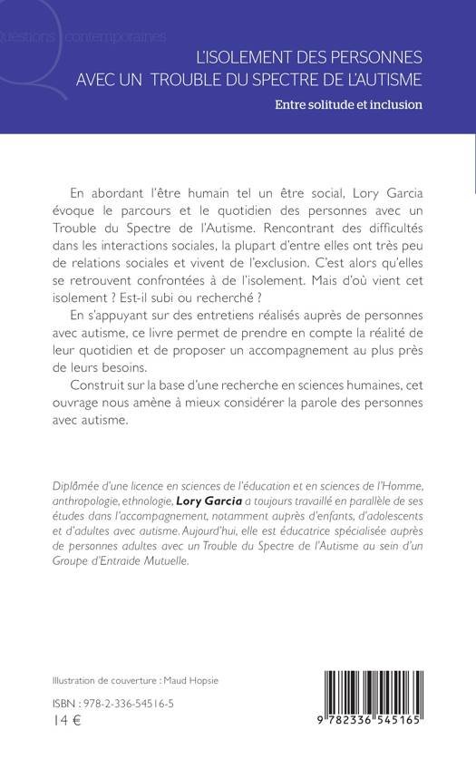 En abordant l'être humain tel un être social, Lory Garcia évoque le parcours et le quotidien des personnes avec un Trouble du Spectre de l'Autisme. Rencontrant des difficultés dans les interactions sociales, la plupart d'entre elles ont très peu de relations sociales et vivent de l'exclusion. C'est alors qu'elles se retrouvent confrontées à de l'isolement. Mais d'où vient cet isolement ? Est-il subi ou recherché ? En s'appuyant sur des entretiens réalisés auprès de personnes avec autisme, ce livre permet de prendre en compte la réalité de leur quotidien et de proposer un accompagnement au plus près de leurs besoins. Construit sur la base d'une recherche en sciences humaines, cet ouvrage nous amène à mieux considérer la parole des personnes avec autisme.