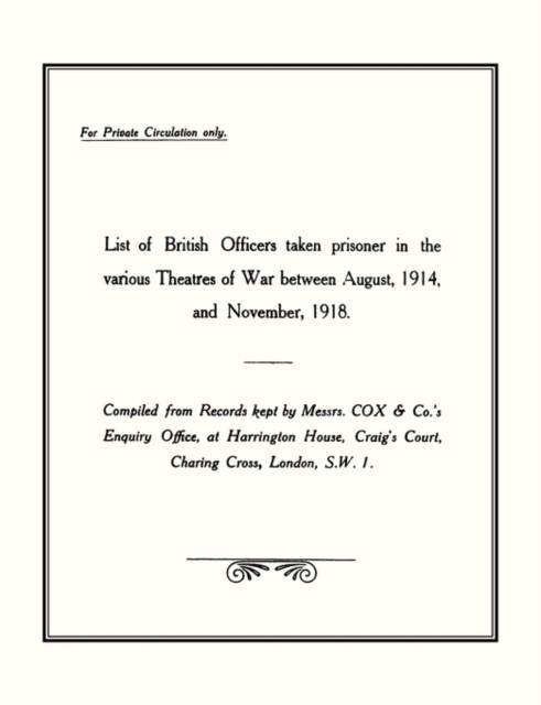 First printed 1919 for private circulation this rare volume (in its first printing) was compiled from records kept by Messrs Cox & Co.'s Enquiry Office, which opened in Sep 1914 in Craig's Court, Charing Cross and gained full support of the War Office. Some 8,700 names are listed, including officers of the RAF, RNAS, RN Div and Dominions. Names are shown by regiments/corps and by battalions within regiments in the order of capture. Deaths in captivity are noted together with dates reported missing and dates of repatriation. The index lists every name in alphabetical order. A very valuable source of information.