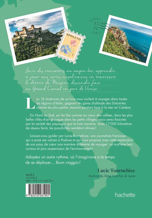 Faire des rencontres au wagon-bar, apprendre à jouer aux cartes napolitaines en traversant le détroit de Messine, descendre face au Grand Canal en gare de Venise… Les 18 itinéraires de ce livre vous invitent à voyager dans toutes les régions d’Italie, gagnant les gares d'altitude des Dolomites comme les plus petites stazioni perdues face à la mer en Calabre. Du Nord au Sud, sur les îles comme au creux des vallées, dans les plus belles villes d'art et jusque dans les petits villages, vous serez fasciné par la variété des paysages que le train traverse. Avec 17 000 kilomètres de réseau ferré, les possibilités semblent infinies ! Laissez-vous guider par Lucie Tournebize : journaliste française qui a posé ses valises a Padoue, elle vous propose avec cette exploration de son pays de cœur une manière différente de voyager : un tourisme lent, curieux et plus respectueux de l'environnement. Adoptez un autre rythme, où l’imaginaire a le temps de se déployer… Buon viaggio !