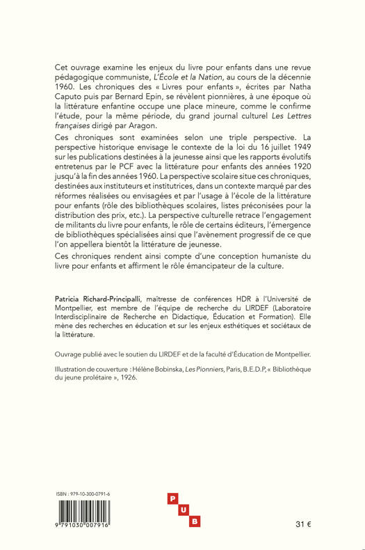 Cet ouvrage examine les enjeux du livre pour enfants dans une revue pédagogique communiste, L’École et la Nation, au cours de la décennie 1960. Les chroniques des « Livres pour enfants », écrites par Natha Caputo puis par Bernard Epin, se révèlent pionnières, à une époque où la littérature enfantine occupe une place mineure, comme le confirme l’étude, pour la même période, du grand journal culturel Les Lettres françaises dirigé par Aragon.