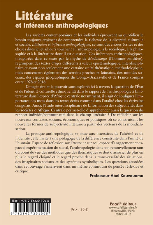 Littérature et Inférences anthropologiques Les sociétés contemporaines et les individus éprouvent au quotidien le besoin toujours croissant de comprendre la richesse de la diversité culturelle et sociale. Littérature et inférences anthropologiques, ce sont des choses écrites et des choses dites ici et ailleurs touchant à l’anthropologie, à la sociologie, à la philosophie et à la littérature dont il est question. Ces inférences anthropologiques, inaugurées dans ce texte par le mythe de Mudumango (l’homme-panthère), regroupent des textes d’âges différents à valeur épistémologique, interdisciplinaire et ayant non seulement une certaine unité thématique, méthodologique, mais concernent également des terrains proches et lointains, des mondes sociaux, des espaces géographiques du Congo-Brazzaville et de France compris entre 1978 et 2018. L’imaginaire et le pouvoir sont explorés ici à travers la question de l’État et de l’identité culturelle ethnique. Et dans le rapport de l’anthropologie à la littérature dans l’espace d’Afrique centrale notamment, il s’agit de souligner l’importance des mots dans les textes écrits comme dans l’oralité chez les écrivains congolais. Ainsi, l’étude interdisciplinaire de la formation des subjectivités dans les sociétés d’Afrique Centrale permet-elle d’appréhender aussi la question du rapport individu/communauté dans le champ littéraire ? De réfléchir sur les nouveaux contextes sociaux, économiques et politiques où se construisent les nouvelles formes de subjectivité littéraire à partir des vecteurs de la mondialisation. La pratique anthropologique se situe aux interstices de l’altérité et de l’identité ; elle invite à une pédagogie de la différence construite dans l’unité de l’humain. Espace de réflexion sur l’Autre et sur soi, espace d’engagement et espace d’expérimentation du social, l’anthropologie dans son renouvellement tant du point de vue des méthodes que des thématiques se doit d’associer de plus en plus le regard éloigné et le regard proche dans la transversalité des situations, des imaginaires sociaux et des systèmes symboliques. Les questions abordées dans cet ouvrage s’inscrivent dans un même continuum de pensée réflexive et critique. Professeur Abel Kouvouama