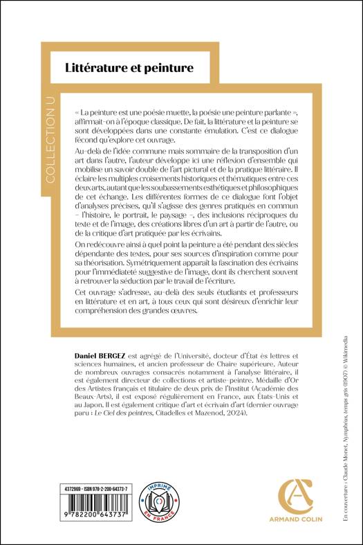 « La peinture est une poésie muette, la poésie une peinture parlante », affirmait-on à l’époque classique. De fait, la littérature et la peinture se sont développées dans une constante émulation. C’est ce dialogue fécond qu’explore cet ouvrage. Au-delà de l’idée commune mais sommaire de la transposition d’un art dans l’autre, l’auteur développe ici une réflexion d’ensemble qui mobilise un savoir double de l’art pictural et de la pratique littéraire. Il éclaire les multiples croisements historiques et thématiques entre ces deux arts, autant que les soubassements esthétiques et philosophiques de cet échange. Les différentes formes de ce dialogue font l’objet d’analyses précises, qu’il s’agisse des genres pratiqués en commun – l’histoire, le portrait, le paysage –, des inclusions réciproques du texte et de l’image, des créations libres d’un art à partir de l’autre, ou de la critique d’art pratiquée par les écrivains. On redécouvre ainsià quel point la peinture a été pendant des siècles dépendante des textes, pour ses sources d’inspiration comme pour sa théorisation. Symétriquement apparaît la fascination des écrivains pour l’immédiateté suggestive de l’image, dont ils cherchent souvent à retrouver la séduction par le travail de l’écriture. Cet ouvrage s’adresse, au-delà des seuls étudiants et professeurs en littérature et en art, à tous ceux qui sont désireux d’enrichir leur compréhension des grandes oeuvres.