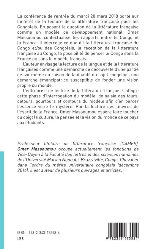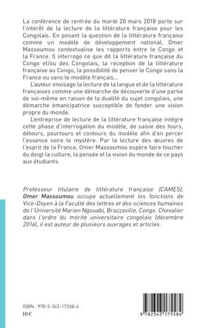 En posant la question de la littérature française comme un modèle de développement national, Omer Massoumou contextualise les rapports entre le Congo et la France. Il interroge ce que dit la littérature française du Congo et/ou des Congolais, la réception de la littérature française au Congo, la possibilité de penser le Congo sans la France ou sans le modèle français... L'auteur envisage la lecture de la langue et de la littérature françaises comme une démarche de découverte d'une partie de soi-même en raison de la dualité du sujet congolais, une démarche émancipatrice suseptible de fonder une vision propre du monde.