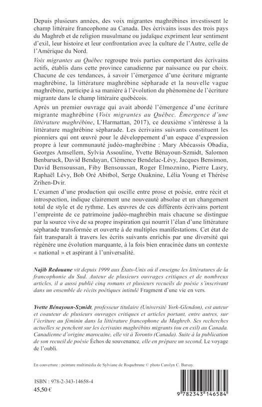Depuis plusieurs années, des voix migrantes magrébines investissent le champ littéraire francophone au Canada. Des écrivains du Maghreb expriment leur sentiment d'exil, leur histoire et leurs confrontations avec la culture de l'Autre, celle de l'Amérique du Nord. Cet ouvrage s'intéresse aux écrivains pionniers qui ont oeuvré pour le développement d'un espace d'expression propre à leur communauté judéo-maghrébine. Chacune de leurs oeuvres se distingue par la souce vive de sa propre inspiration qui nourrit l'élan d'une littérature sépharade transformée et ouverte à de multiples manifestations.