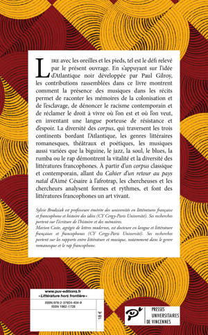 Lire avec les oreilles et les pieds, tel est le défi relevé par le présent ouvrage. En s’appuyant sur l’idée d’Atlantique noir développée par Paul Gilroy, les contributions rassemblées dans ce livre montrent comment la présence des musiques dans les récits permet de raconter les mémoires de la colonisation et de l’esclavage, de dénoncer le racisme contemporain et de réclamer le droit à vivre où l’on est et où l’on veut, en inventant une langue porteuse de résistance et d’espoir. La diversité des corpus, qui traversent les trois continents bordant l’Atlantique, les genres littéraires romanesques, théâtraux et poétiques, les musiques aussi variées que la biguine, le jazz, la soul, le blues, la rumba ou le rap démontrent la vitalité et la diversité des littératures francophones. À partir d’un corpus classique et contemporain, allant du Cahier d’un retour au pays natal d’Aimé Césaire à l’afrotrap, les chercheuses et les chercheurs analysent formes et rythmes, et font des littératures francophones un art vivant.