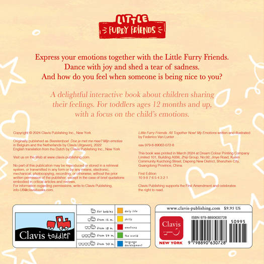 Express your emotions together with the Little Furry Friends in this delightful interactive book. Dance with joy and shed a tear of sadness. And how do you feel when someone is being nice to you