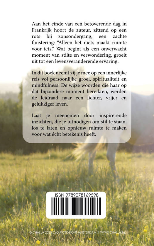 Aan het einde van een betoverende dag in Frankrijk hoort de auteur, zittend op een rots bij zonsondergang, een zachte fluistering: “Alleen het niets maakt ruimte voor iets.” Wat begint als een onverwacht moment van stilte en verwondering, groeit uit tot een levensveranderende ervaring. In dit boek neemt zij je mee op een innerlijke reis vol persoonlijke groei, spiritualiteit en mindfulness. De wijze woorden die haar op dat bijzondere moment bereikten, werden de leidraad naar een lichter, vrijer en gelukkiger leven. Laat je meenemen door inspirerende inzichten die je uitnodigen om stil te staan, los te laten en opnieuw ruimte te maken voor wat écht betekenis heeft. Een boek voor iedereen die verlangt naar rust, helderheid en een dieper begrip van zichzelf.